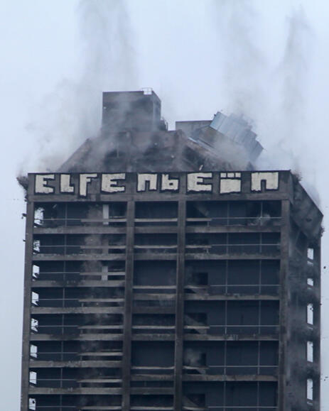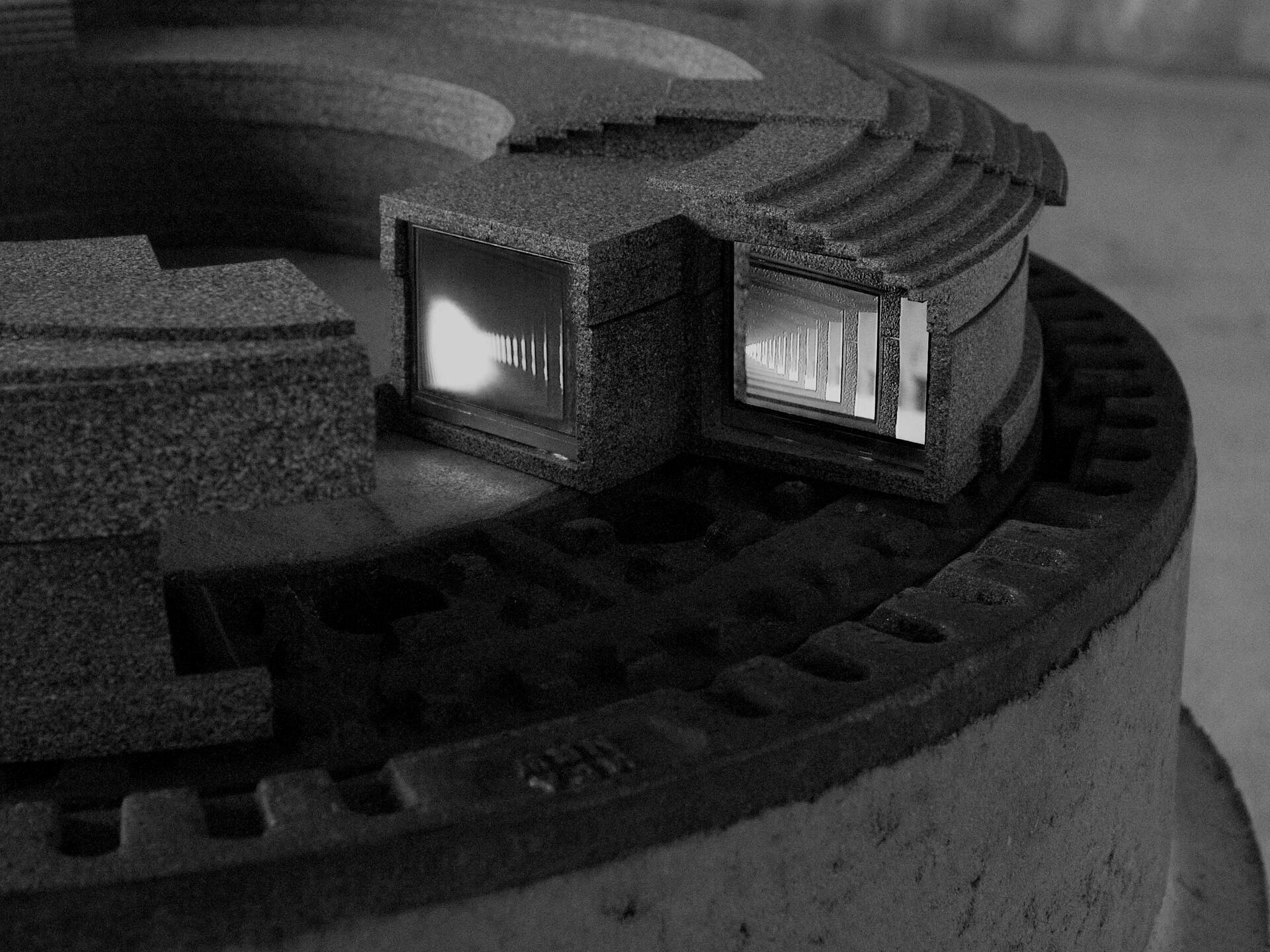 A live sculpture. The smallscaled GCHQ building in Cheltenham, UK includes two cameras which are pointed onto two monitors to create a „picture in picture“ effect. Individuals of the exibition audience get captured by the cameras and „sucked in“ the buildings machinery.