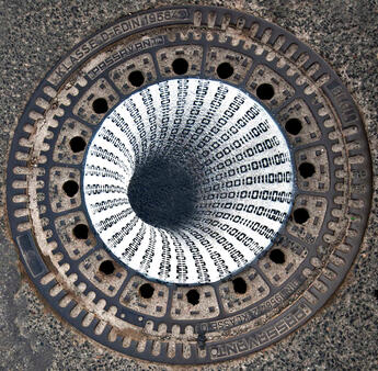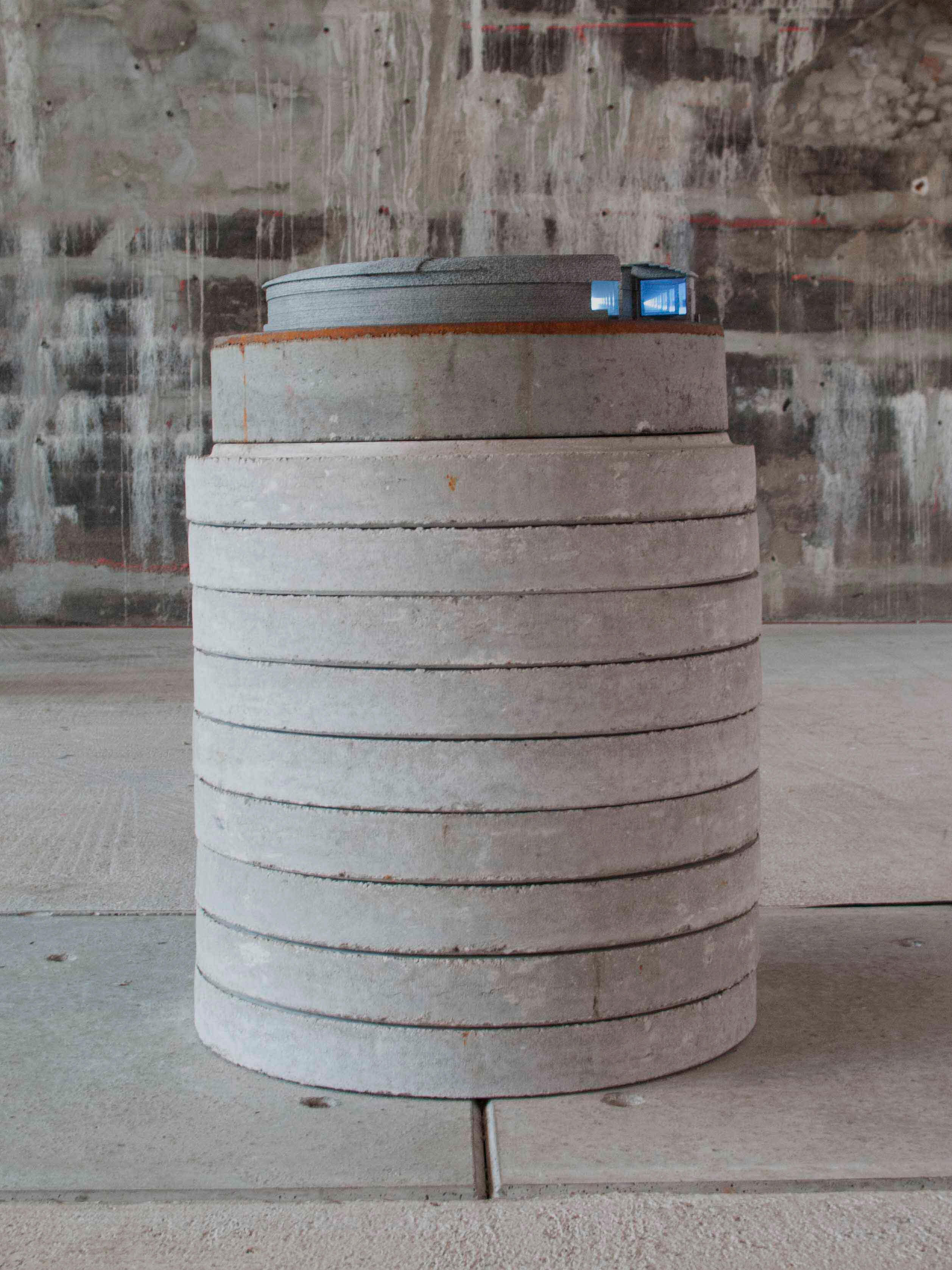 Two monitors & cameras, acrylic paint, wood, glue, manhole cover, concrete rings