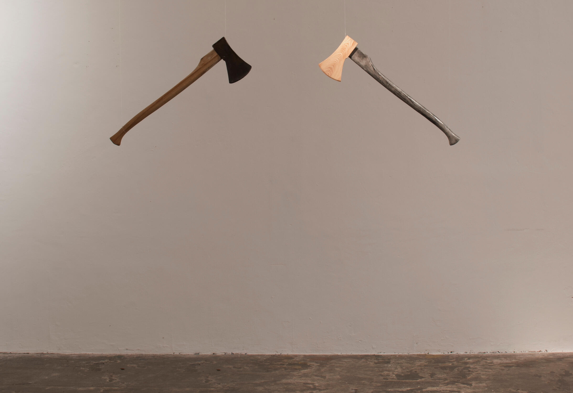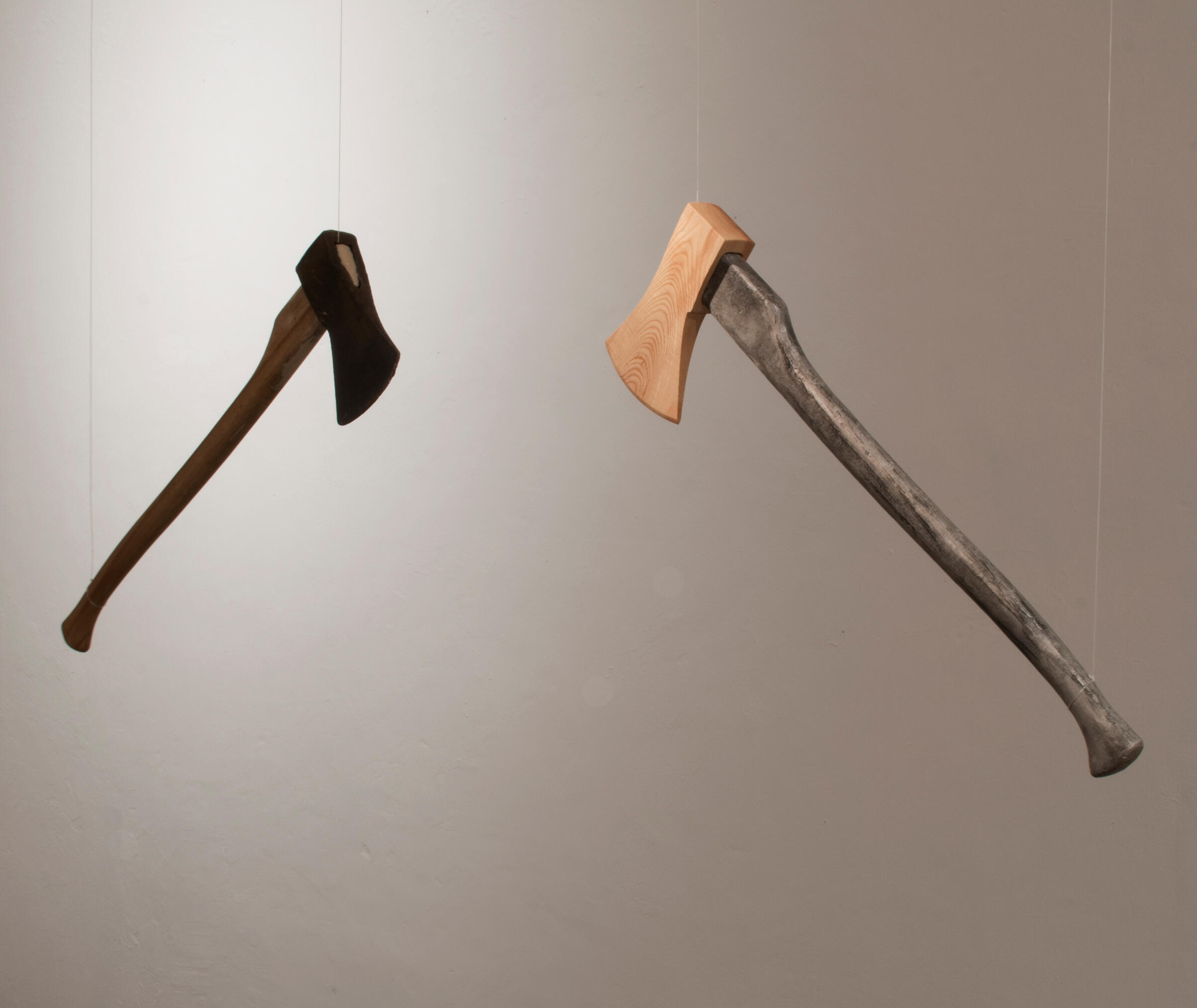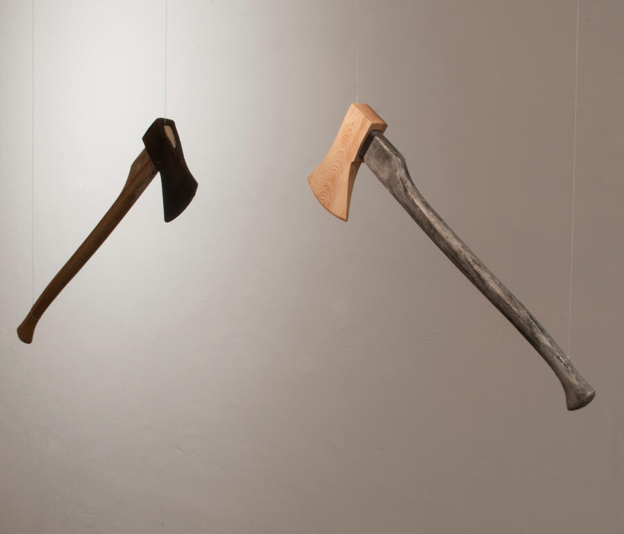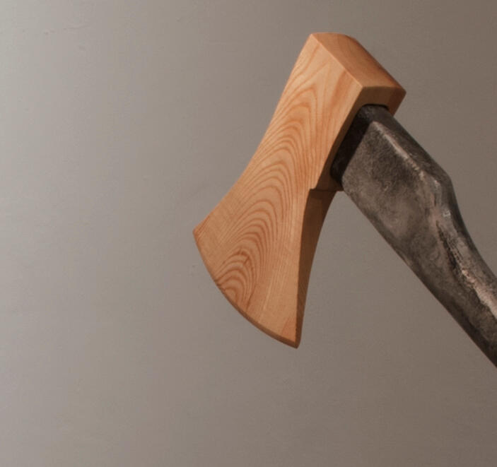 An ordinary axe in contrast with its inverted materials: The blade is made of ash wood, the shaft is a steel cast resin of the original.