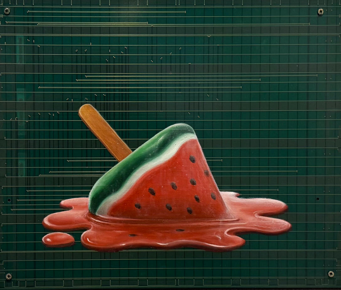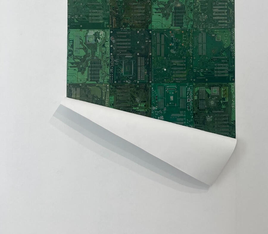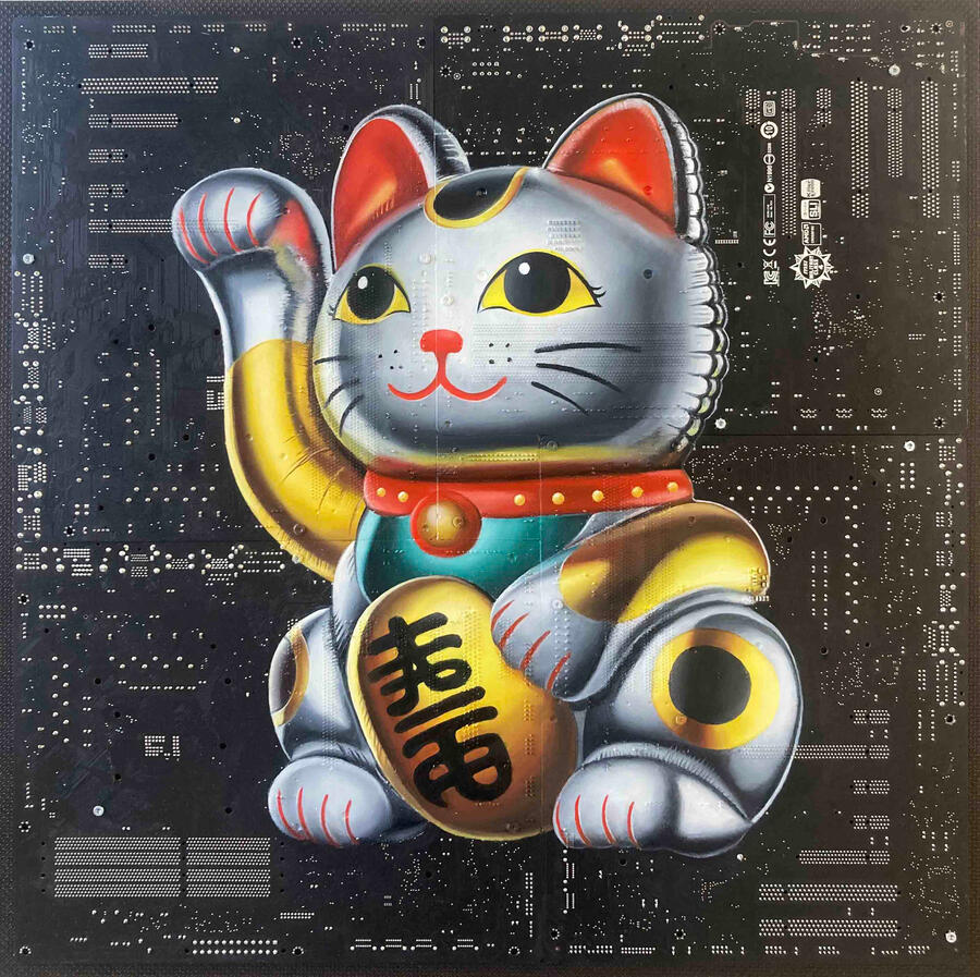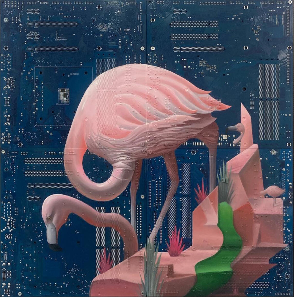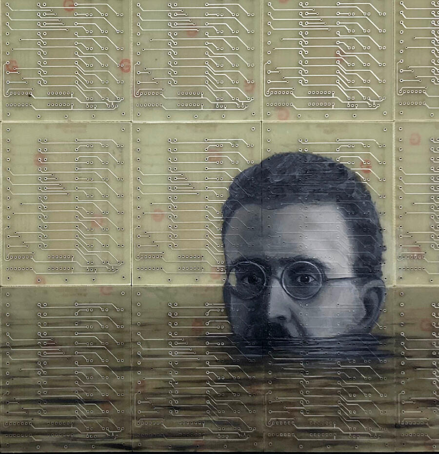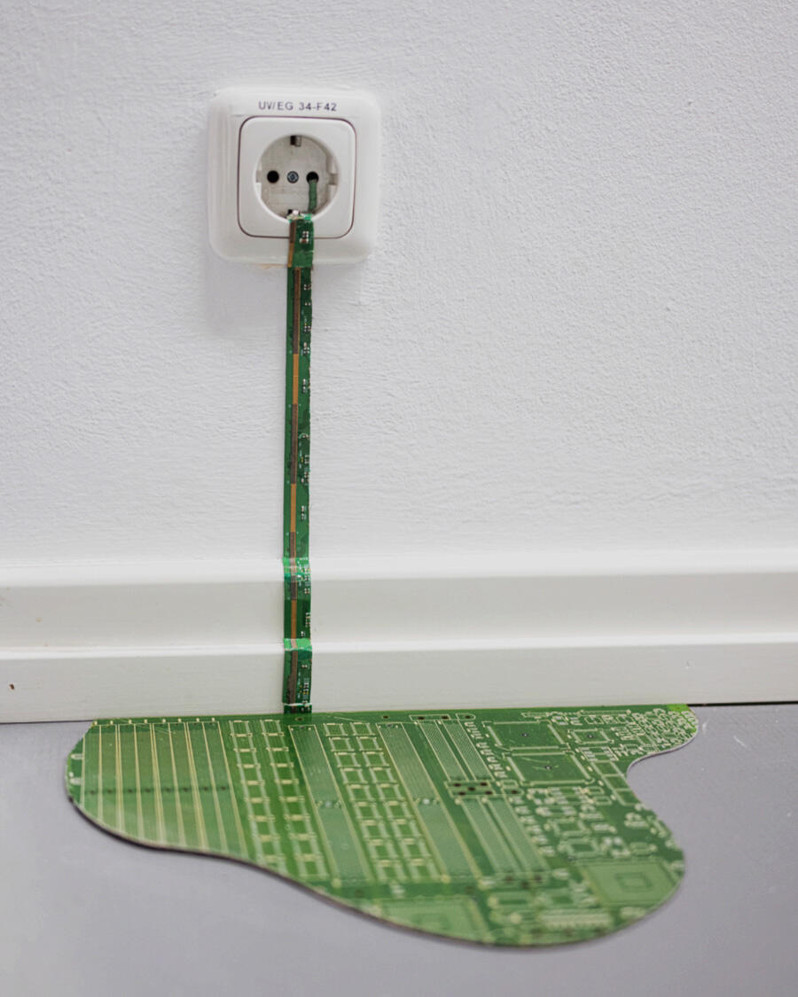 Philipp Alexander Schäfer is a visual artist whose work examines the material infrastructures of the digital age. Using elecronic components, he transforms the physical remains of digital systems into sculptural and painterly forms.A central element of his recent work is the use of Printed Circuit Boards (PCB) as painting surfaces. These electronic substrates function both as material and metaphor, referencing the invisible networks that structure contemporary life. By combining traditional oil painting with technological materials, his works create a tension between analog artistic processes and the logic of digital systems. Schäfer’s images often merge cultural symbols with electronic circuitry, reflecting how identity, belief systems and visual culture increasingly circulate within global technological infrastructures.Schäfer holds a Diploma in Political Sciences from Goethe University in Frankfurt. He has received several awards and grants, including the Exhibition Grant of the Heussenstamm Foundation (2025), the Working Grant of the Hessian Cultural Foundation (2020), and the Citoyenne Prize (2018).