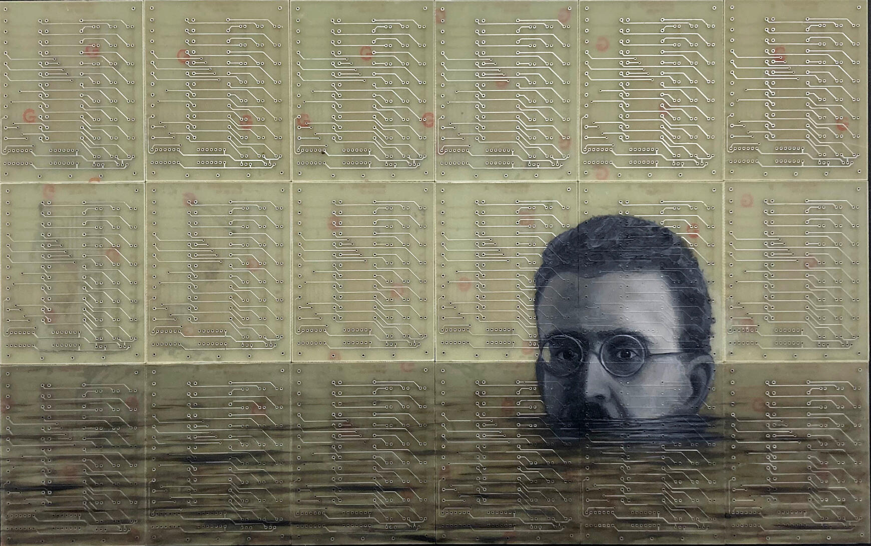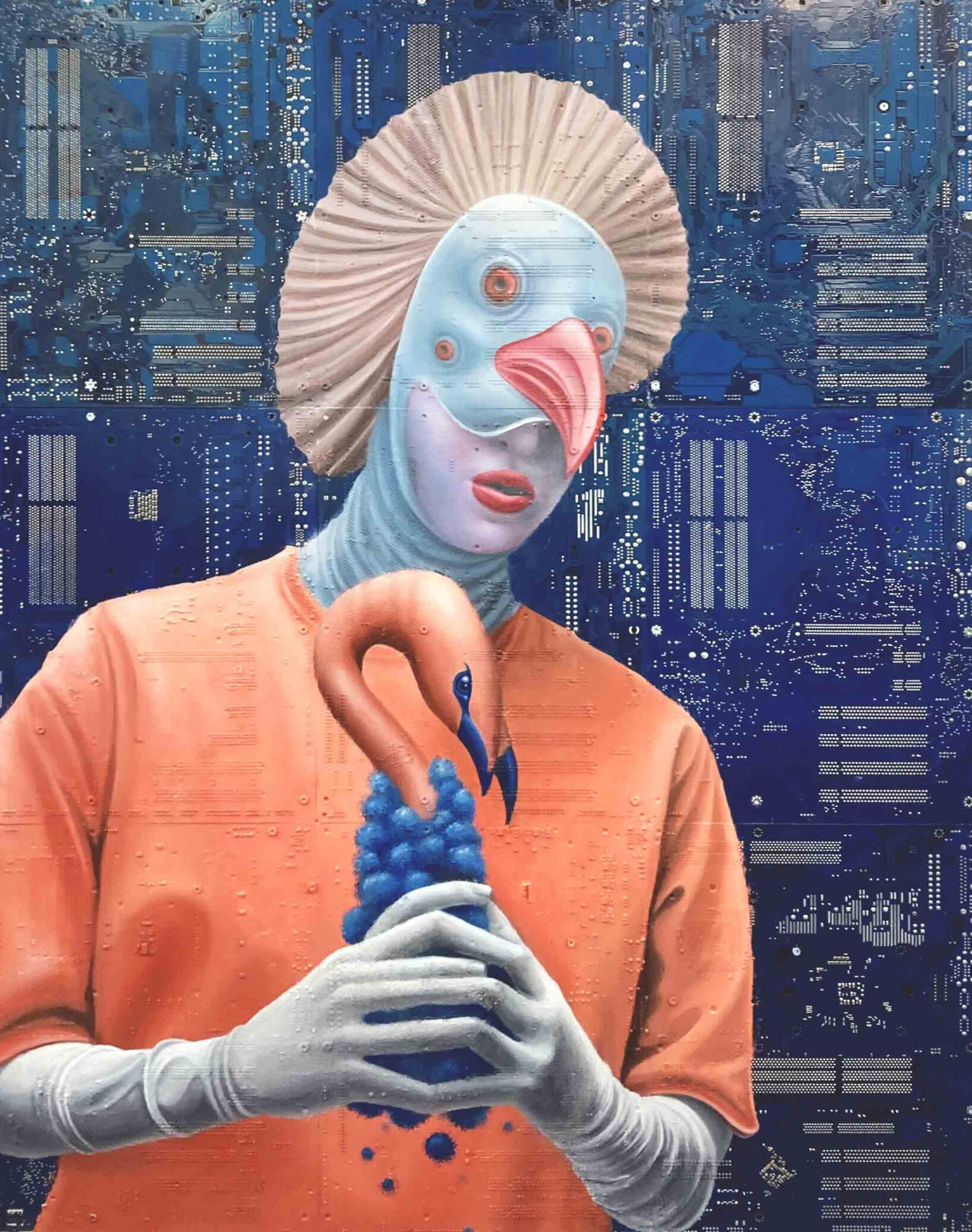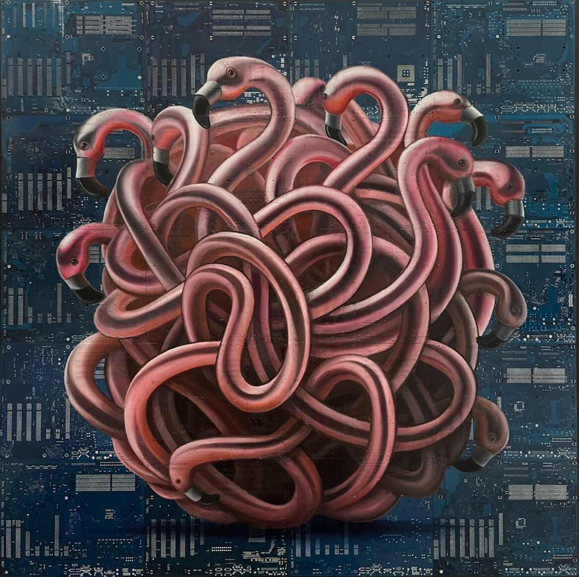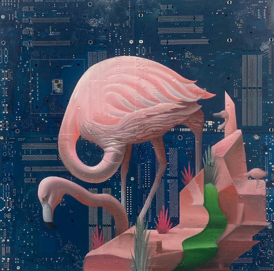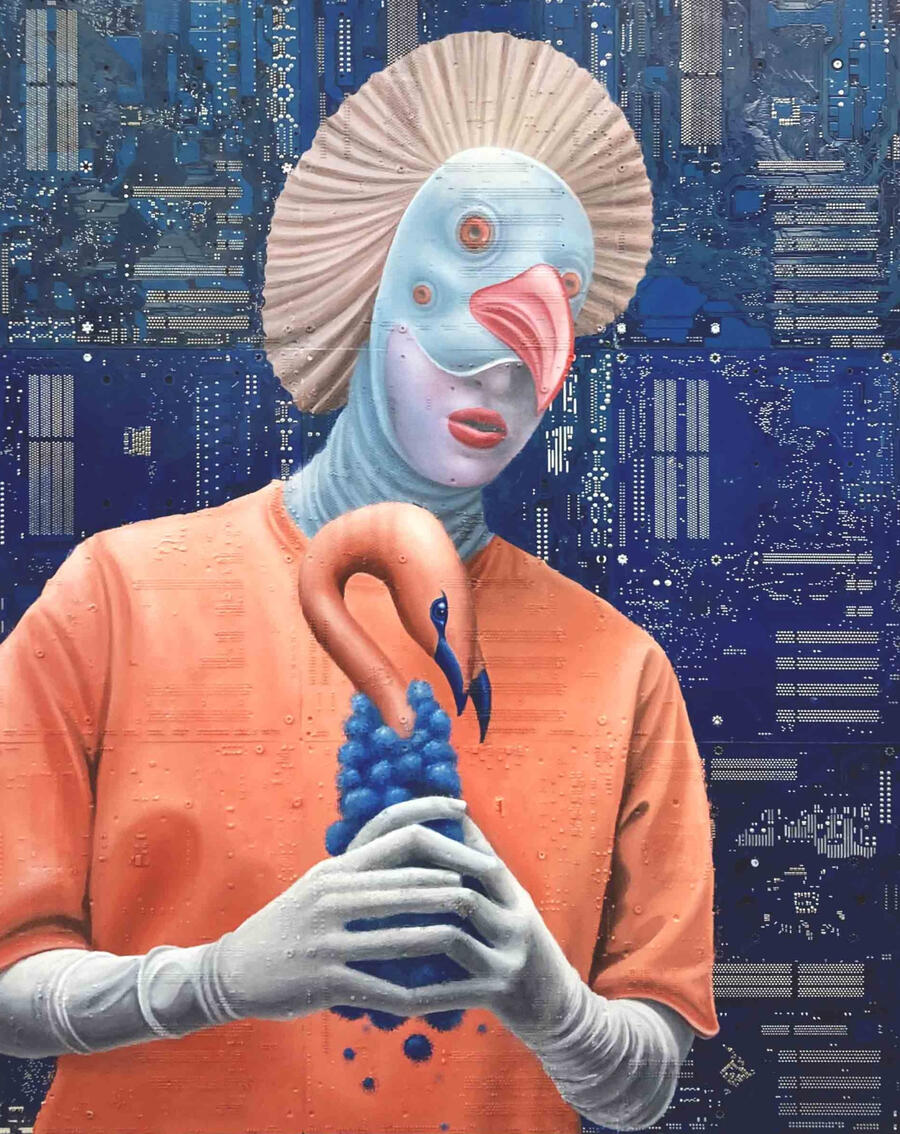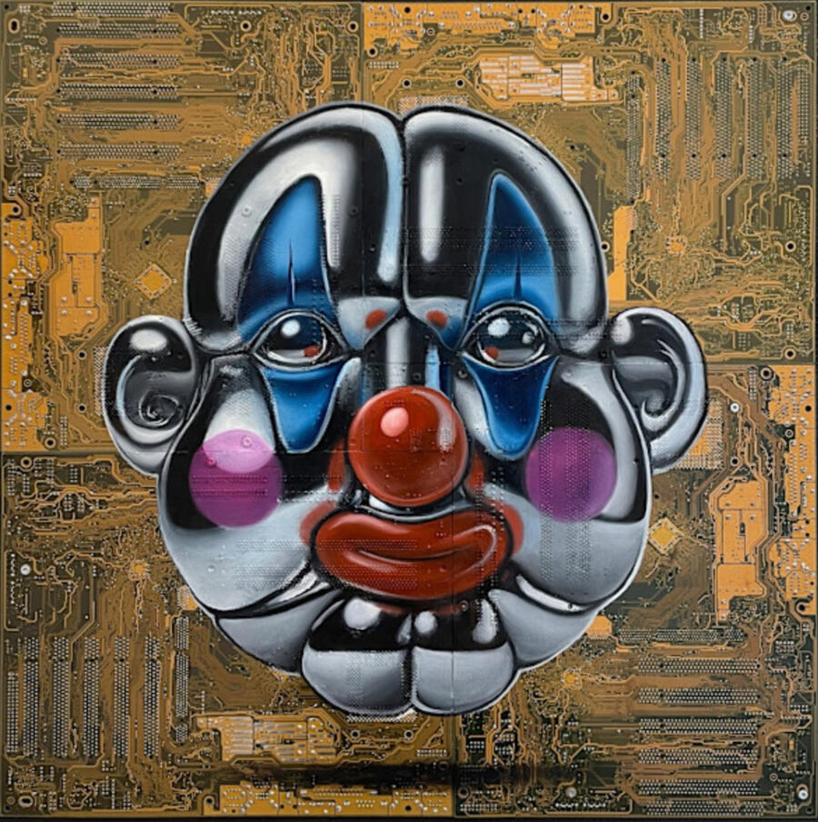 Philipp Alexander Schäfer is a visual artist whose work examines the material infrastructures of the digital age. Using elecronic components, he transforms the physical remains of digital systems into sculptural and painterly forms.A central element of his recent work is the use of Printed Circuit Boards (PCB) as painting surfaces. These electronic substrates function both as material and metaphor, referencing the invisible networks that structure contemporary life. By combining traditional oil painting with technological materials, his works create a tension between analog artistic processes and the logic of digital systems. Schäfer’s images often merge cultural symbols with electronic circuitry, reflecting how identity, belief systems and visual culture increasingly circulate within global technological infrastructures.Schäfer holds a Diploma in Political Sciences from Goethe University in Frankfurt. He has received several awards and grants, including the Exhibition Grant of the Heussenstamm Foundation (2025), the Working Grant of the Hessian Cultural Foundation (2020), and the Citoyenne Prize (2018).