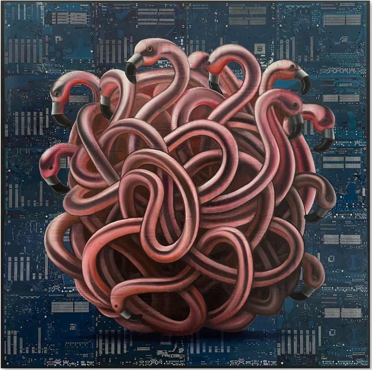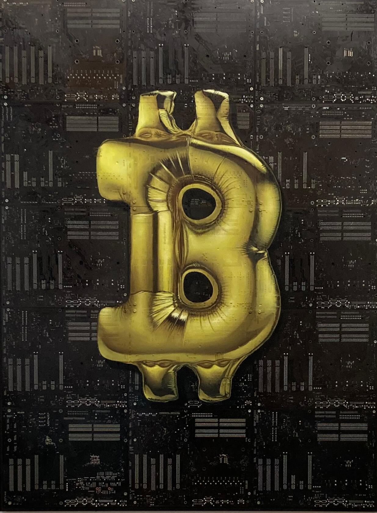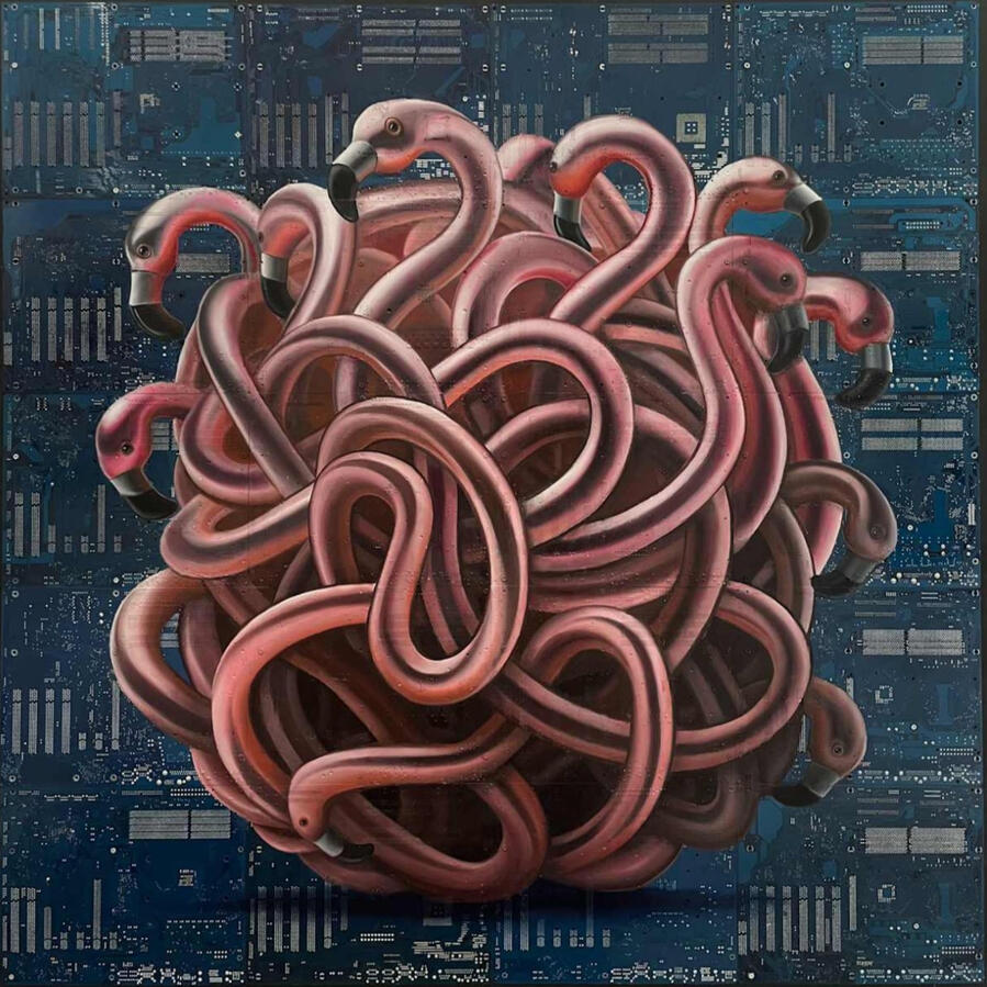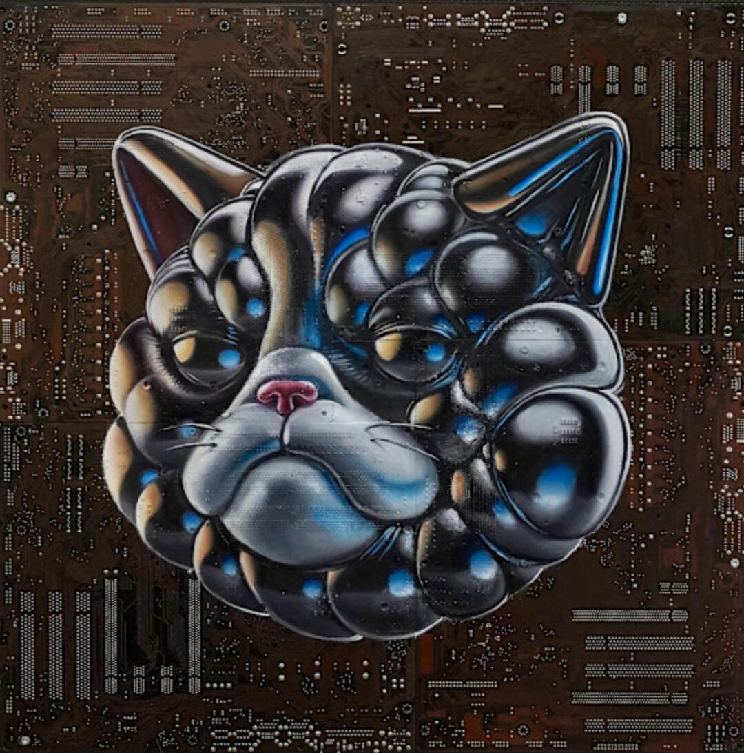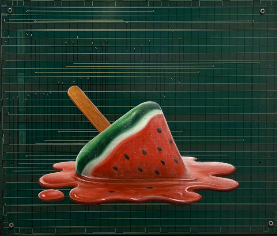 Philipp Alexander Schäfer is a visual artist whose work examines the material infrastructures of the digital age. Using elecronic components, he transforms the physical remains of digital systems into sculptural and painterly forms.A central element of his recent work is the use of Printed Circuit Boards (PCB) as painting surfaces. These electronic substrates function both as material and metaphor, referencing the invisible networks that structure contemporary life. By combining traditional oil painting with technological materials, his works create a tension between analog artistic processes and the logic of digital systems. Schäfer’s images often merge cultural symbols with electronic circuitry, reflecting how identity, belief systems and visual culture increasingly circulate within global technological infrastructures.Schäfer holds a Diploma in Political Sciences from Goethe University in Frankfurt. He has received several awards and grants, including the Exhibition Grant of the Heussenstamm Foundation (2025), the Working Grant of the Hessian Cultural Foundation (2020), and the Citoyenne Prize (2018).