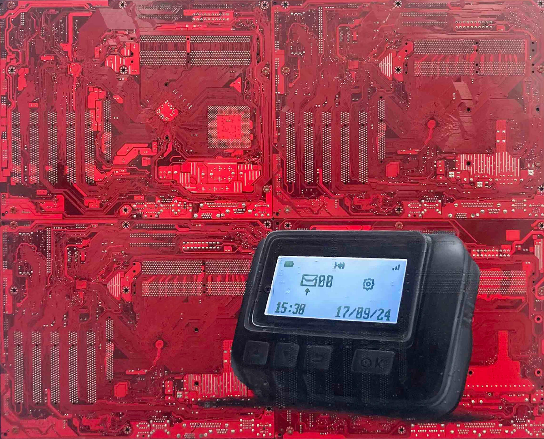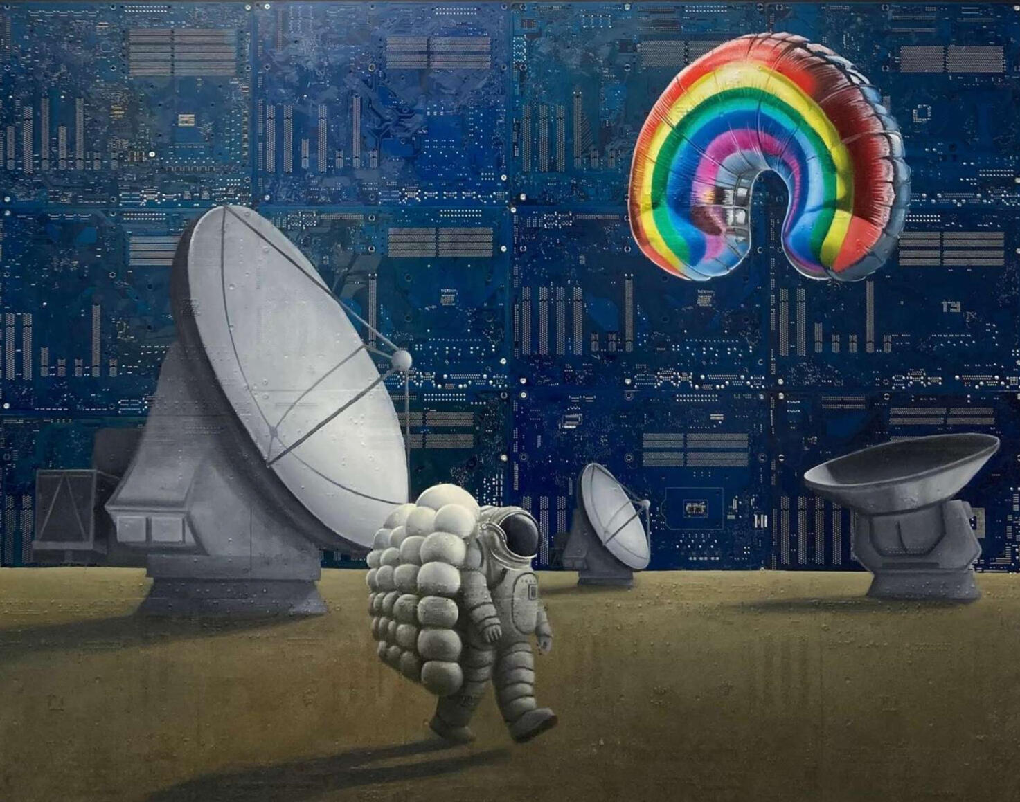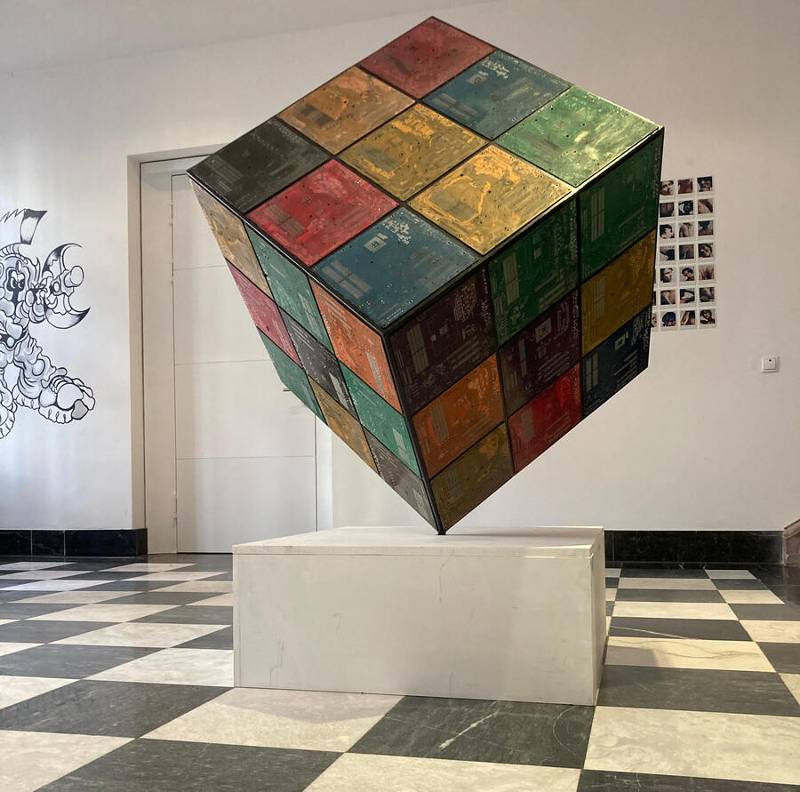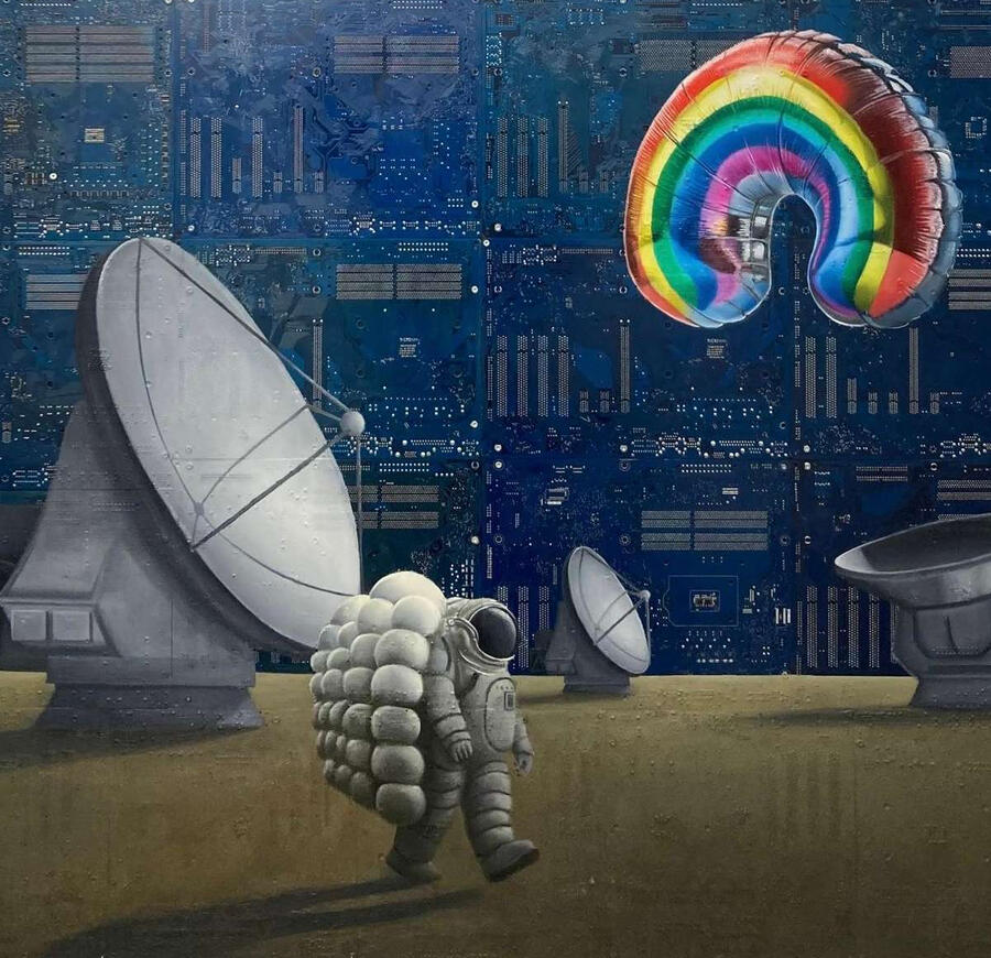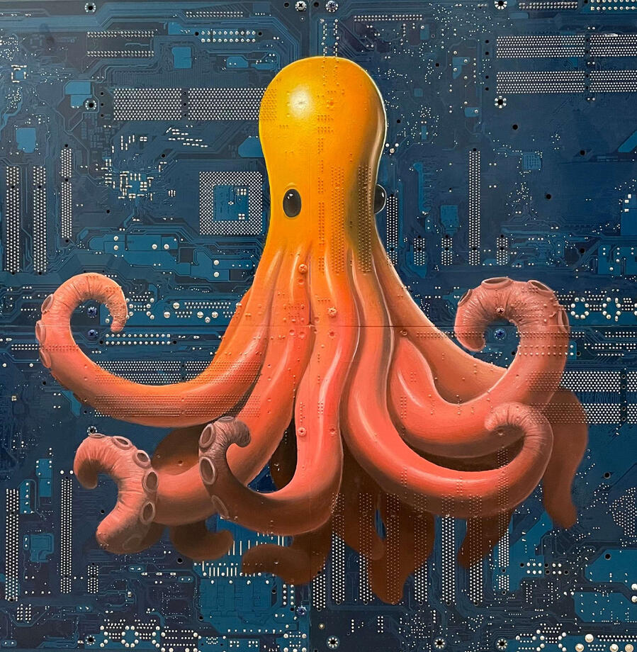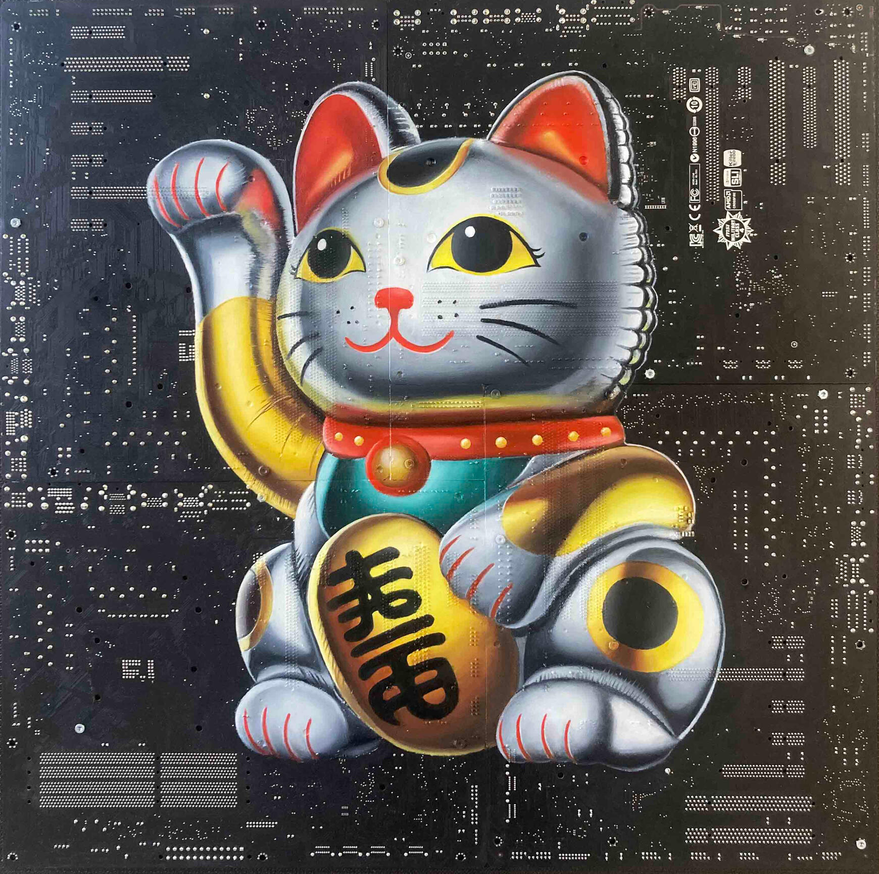 Philipp Alexander Schäfer is a visual artist whose work examines the material infrastructures of the digital age. Using elecronic components, he transforms the physical remains of digital systems into sculptural and painterly forms.A central element of his recent work is the use of Printed Circuit Boards (PCB) as painting surfaces. These electronic substrates function both as material and metaphor, referencing the invisible networks that structure contemporary life. By combining traditional oil painting with technological materials, his works create a tension between analog artistic processes and the logic of digital systems. Schäfer’s images often merge cultural symbols with electronic circuitry, reflecting how identity, belief systems and visual culture increasingly circulate within global technological infrastructures.Schäfer holds a Diploma in Political Sciences from Goethe University in Frankfurt. He has received several awards and grants, including the Exhibition Grant of the Heussenstamm Foundation (2025), the Working Grant of the Hessian Cultural Foundation (2020), and the Citoyenne Prize (2018).