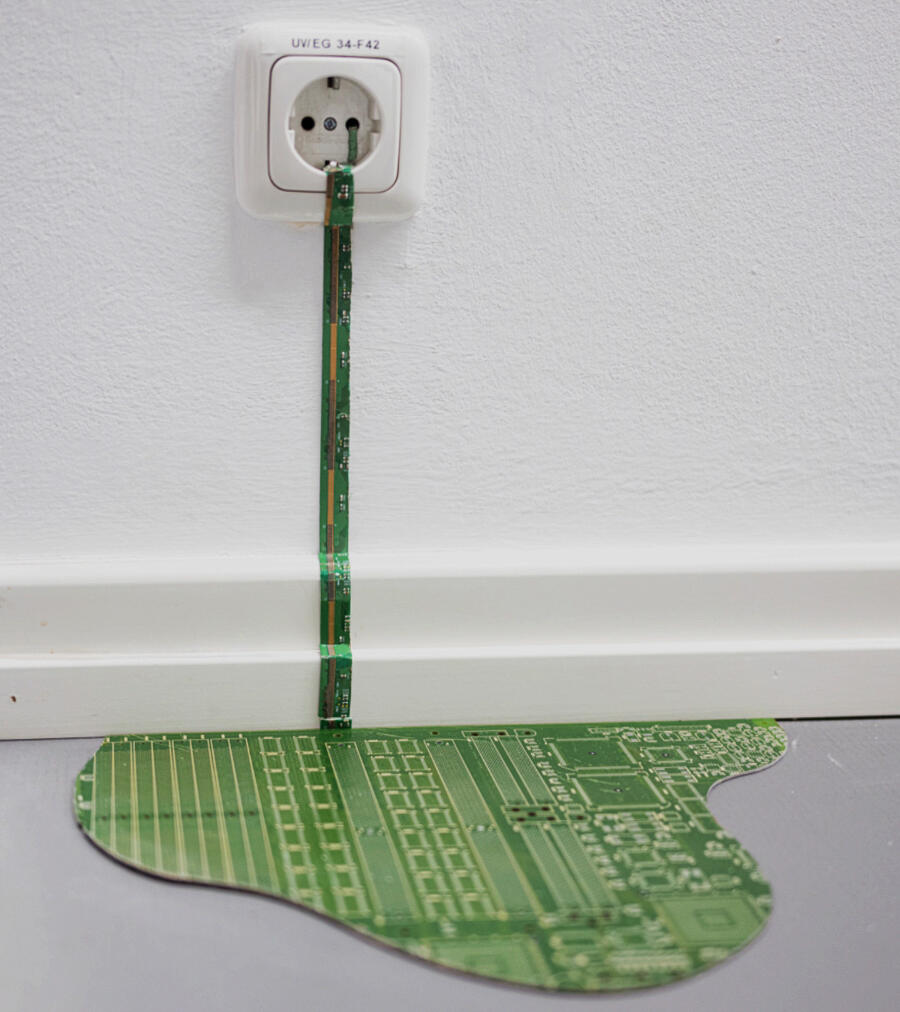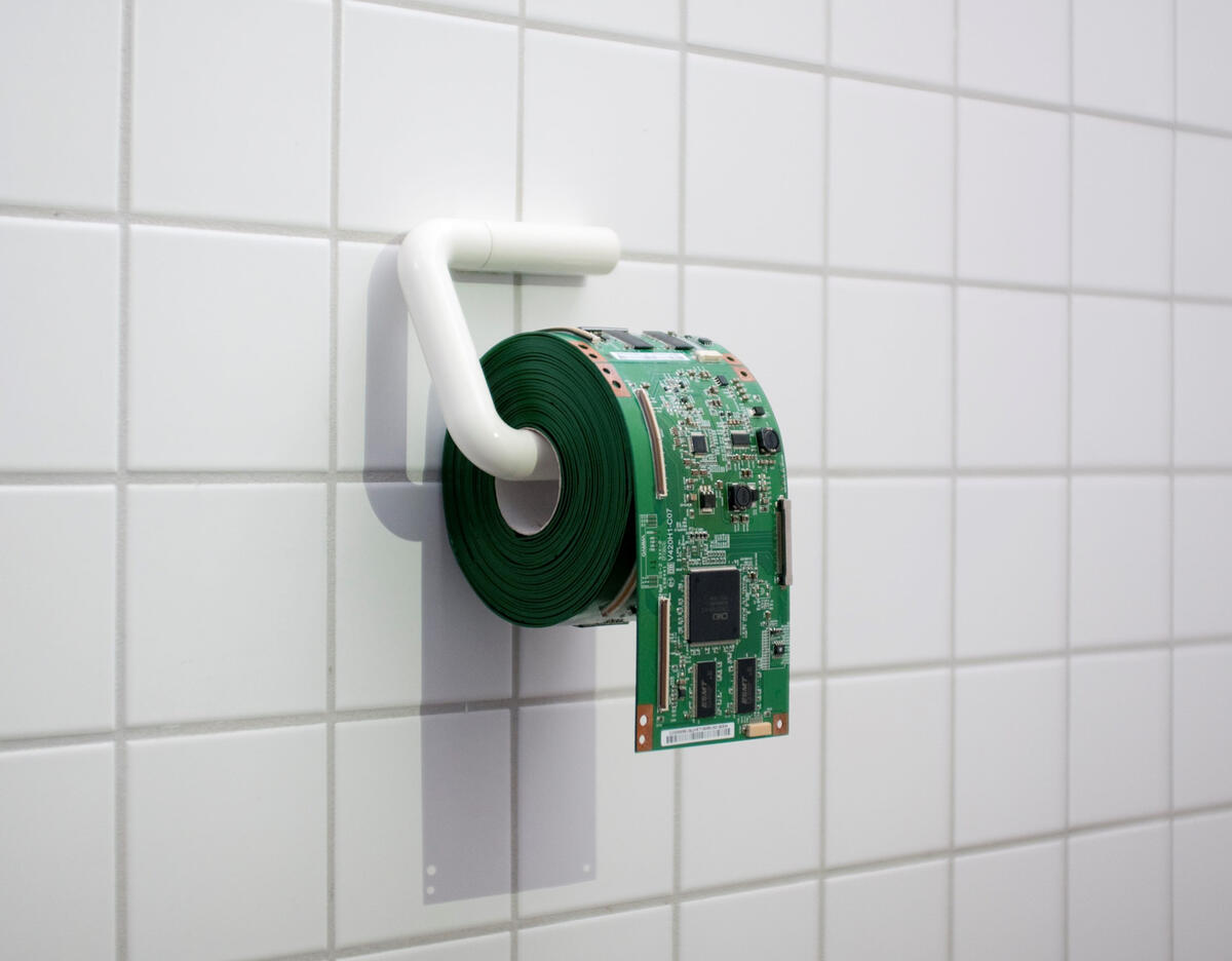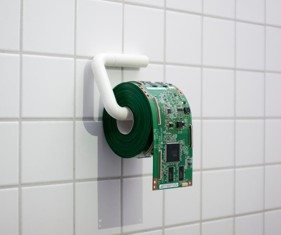 „PCB toiletroll“ is a sculpture combining a customary toiletroll with a specific Printed Circuit Board (PCB), in this case the motherboard V420H1-C07 for flatscreen monitors.